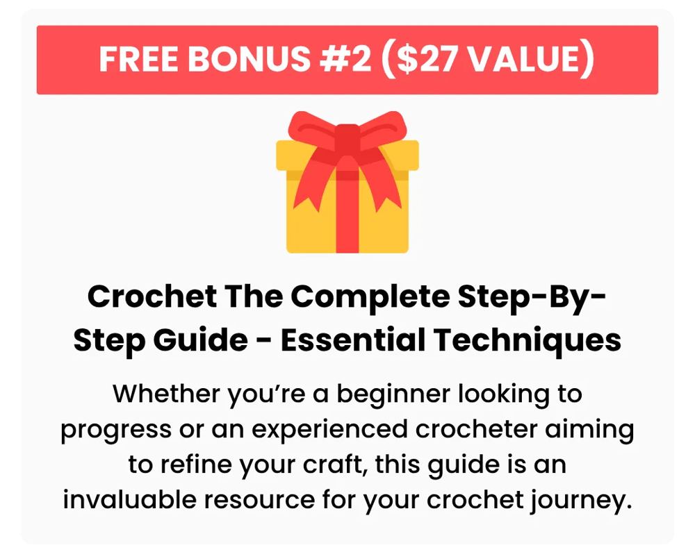 ​For the next 20 people who take action today and proceed, you will also be awarded with Fast Action Bonuses worth $81 Absolutely FREE that will help you make your Crochet Journey more smooth and efficient!
